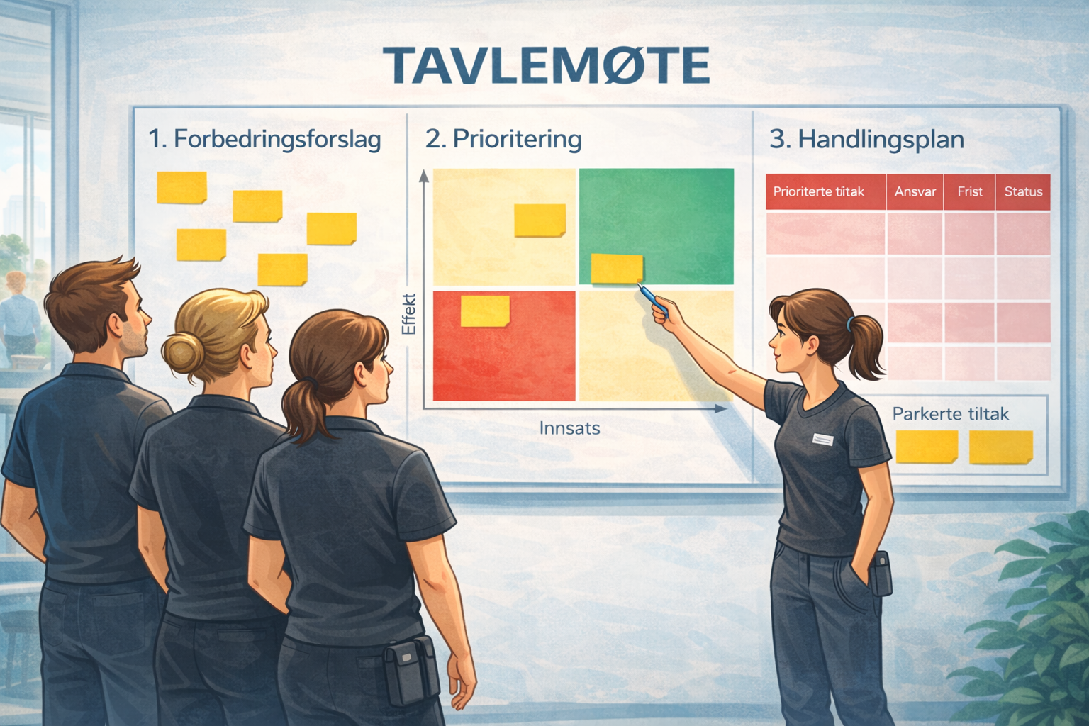 Tavlemøter er et enkelt, men kraftfullt verktøy i forbedringsarbeid. I praksis innebærer det at teamet møtes jevnlig – gjerne ukentlig – foran en fysisk eller digital tavle, og tar opp små og store forhold i arbeidshverdagen. Det kan være alt fra logistikk og fordeling av oppgaver til utstyr, HMS og samarbeidsforhold.